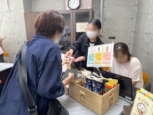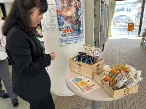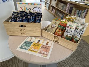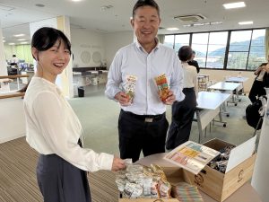 販売したのは、ケチャップやなめ茸、ロングライフパン、市内の老舗和菓子店さんのお餅やゼリーなど、地域企業の「社会貢献食品」。