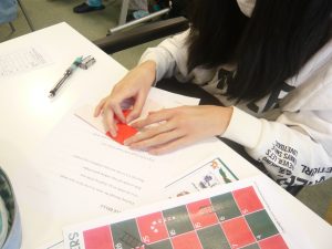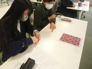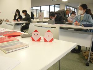 「ジングルベル」の歌を英語で歌うのは難しかったです。かわいいサンタクロースの折り紙をしました。